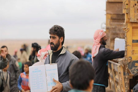 تظهر هذه الصورة ملف رجل يحمل صندوقًا من المساعدات الإنسانية التي وزعتها جمعية الهلال الأحمر العربي السوري في مخيم الركبان ، 07 نوفمبر 2018. وكالة حماية البيئة