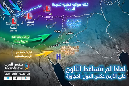 افراسيانت - موقع Arabiaweather.com - رامي عبيد - شهدت كل من سوريا ولبنان خلال الــ 24 ساعة الماضية تساقطاً كثيفاً للثلوج على المرتفعات الجبلية إضافة لتساقط الامطار الغزيرة على السواحل، وفي نفس الوقت شهدت الأردن ووسط وجنوب فلسطين اجواءً مستقرة وشديدة البرودة مع هبوب رياح جنوبية غربية نشطة مع هبات قوية احياناً،فما سبب هذا الفرق الكبير في الأجواء على الرغم من قرب المسافة الجغرافية؟