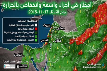 ومن خطر شدّة العواصف الرعدية وربما الصواعق وبالأخص في شرق وجنوب البلاد.