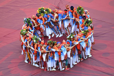 The opening ceremony turned the St. Petersburg Arena into the setting for a spectacular and bright show, with more than 2,000 actors involved in the performance.
