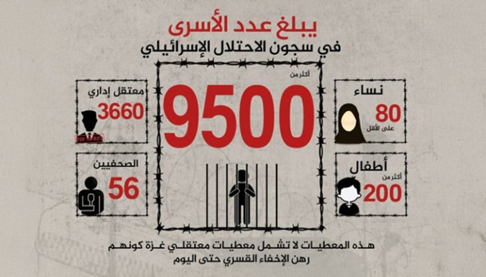 ويقبع في السجون الإسرائيلية نحو 9900 أسير فلسطيني، موزعين على 22 سجنا داخل الأراضي المحتلة تابعة لمصلحة السجون، والعديد من معسكرات الاعتقال التابعة للجيش الإسرائيلي.