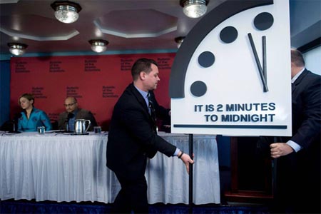 ويشرف على تحديد موقع عقارب هذه الساعة علماء وخبراء دوليون، وهي ساعة رمزية تنذر من خطر حصول كارثة كبرى على الأرض كلما اقتربت عقاربها من منتصف الليل، وقد صممتها نشرة علماء الذرة كمؤشر على إمكانية فناء العالم.