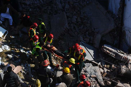 وذكر جام ساجد حسين المتحدث باسم اجهزة الانقاذ ان 100 شخص لا زالوا محتجزين تحت الانقاض، فيما تنقل عربات الاسعاف الجرحى الى المستشفى.