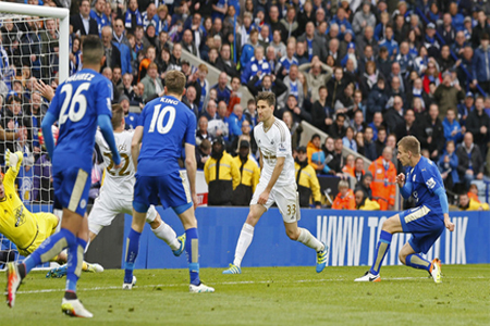 افراسيانت - واصل فريق ليستر سيتي زحفه نحو التتويج بلقب بطل الدوري الإنجليزي الممتاز لكرة القدم، بعد فوزه العريض على ضيفه سوانزي سيتي بأربعة أهداف نظيفة، وذلك ضمن مباريات المرحلة 35 من الدوري.