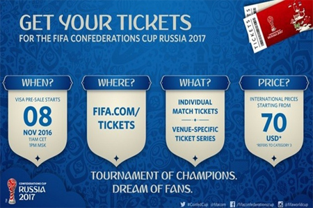 افراسيانت - أعلن الاتحاد الدولي لكرة القدم "فيفا"، الاثنين 7 نوفمبر/تشرين الثاني، أنه سيبدأ، اعتبارا من البوم الثلاثاء، بيع تذاكر مباريات بطولة كأس القارات 2017 في روسيا.