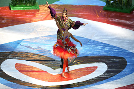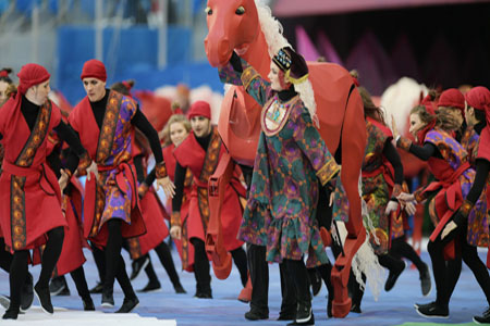 The “khorovod” traditional Russian round dance and funfair with more characters from Russian folklore were also featured in the ceremony.