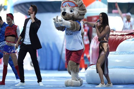 The cup's mascot, Zabivaka the Wolf, made a spectacular appearance, descending into the arena on a cloud-turned-air balloon.