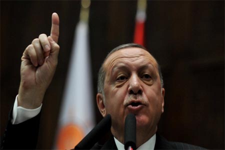 President Recep Tayyip Erdogan delivered the inflammatory comments while speaking before a gathering of his ruling AK Party in the Turkish city of Mersin on Saturday.